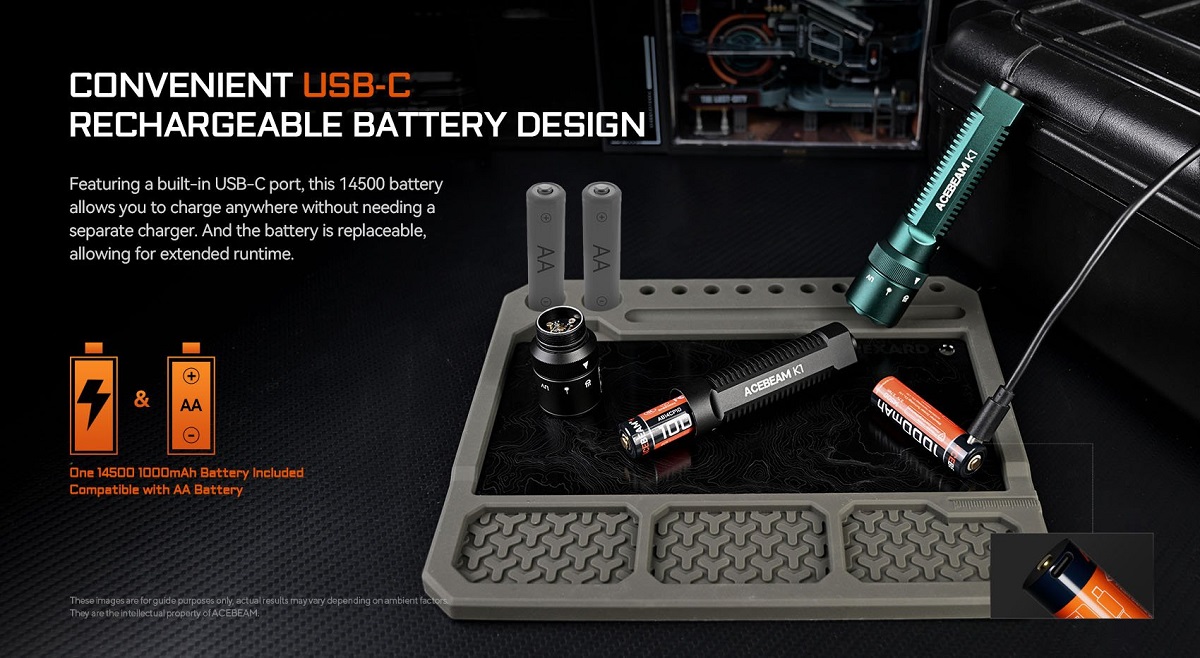 Die K1 verfügt über einen per USB-C wiederaufladbaren 14500 - 1000 mAh Akku, der mit AA-Batterien kompatibel ist, und besteht aus langlebigem AL6061-T6 Aluminium mit Harteloxierung in Militärqualität.